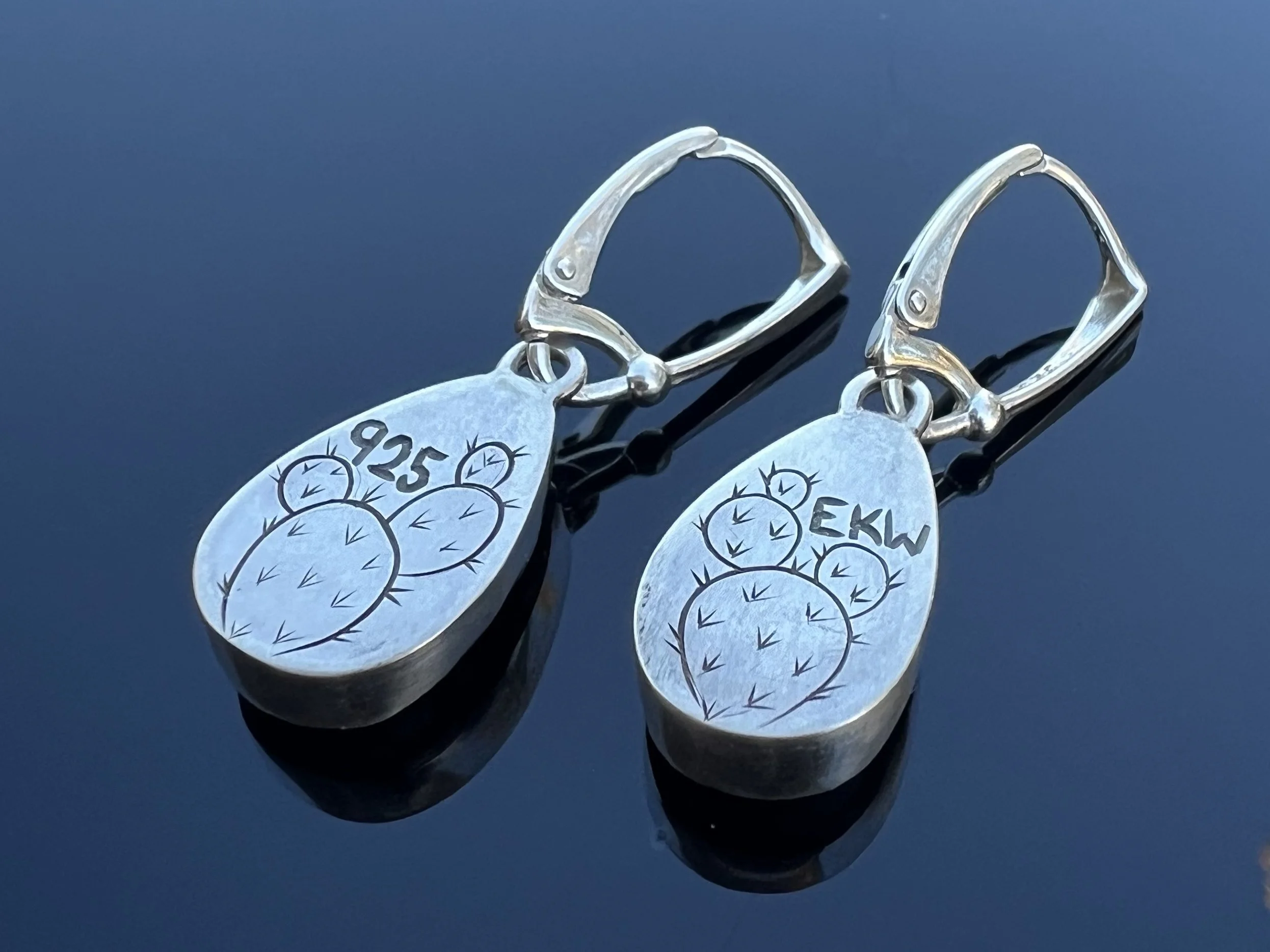 Two perfectly matched rhodochrosite pairs make up these elegant earrings. All wrapped in fine and sterling silver. The larger stones that hang below have open backs, allowing for light to pass through the stone- making them glow in the sunlight. The backs are hand engraved with the tiniest hearts. Signed “EKW” and marked “925” for sterling silver. These come with oversized push backs which disperse the weight, making them easier to wear for long periods. These weigh 5 grams each. They measure 42mm long, 11mm wide.