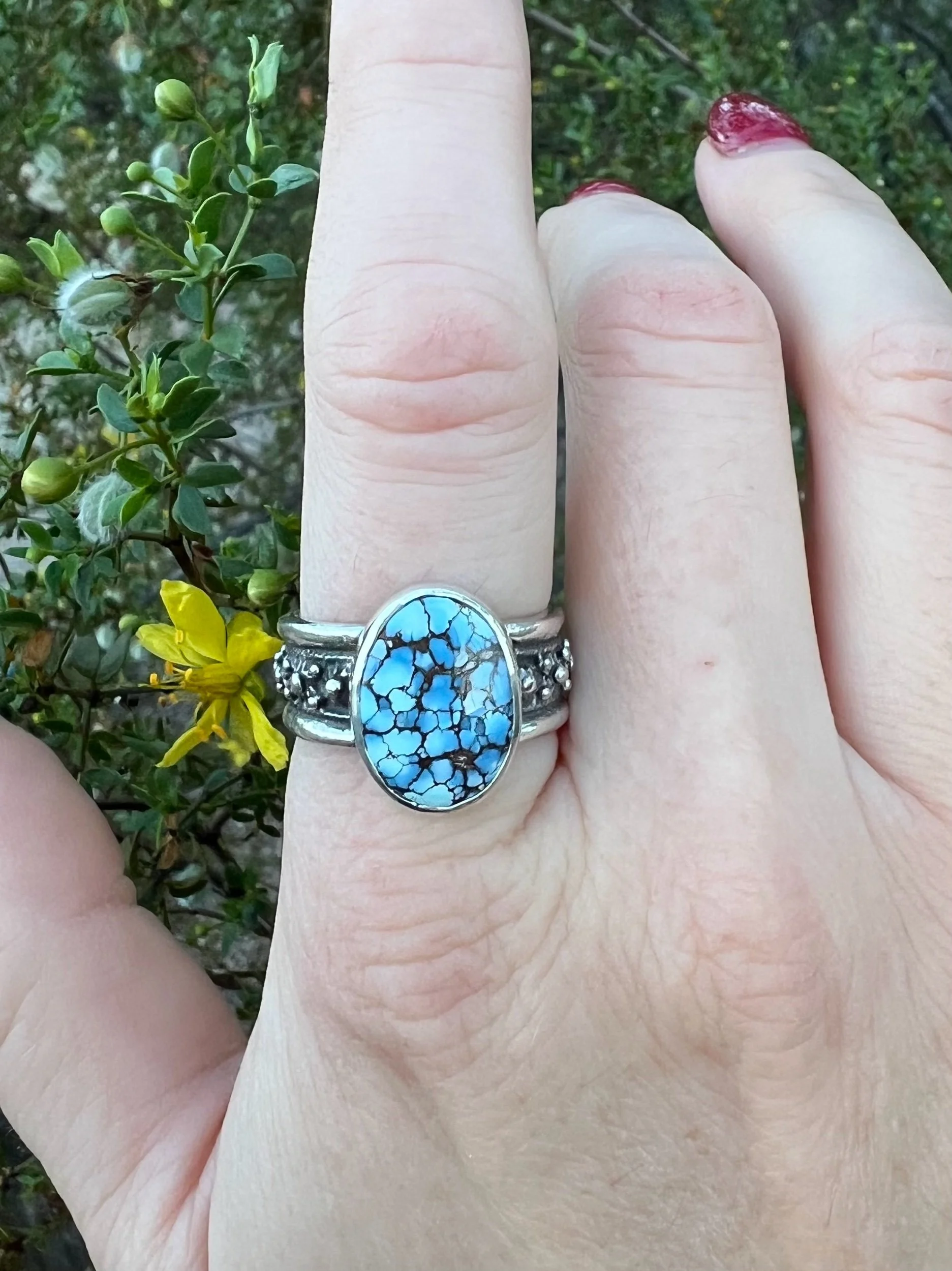 Size 8.5 ring. Hand carved design has been small batch cast in solid sterling silver. Each side is hand engraved after the casting process, making each ocotillo unique in its own way. Carnelian precisely cut to fit the inlay face. The inside of the band is marked “925” for sterling silver and signed “EKW”. Made by a single pair of hands- all design, casting, engraving, and lapidary work done by Elizabeth Williams in Tucson, Arizona.