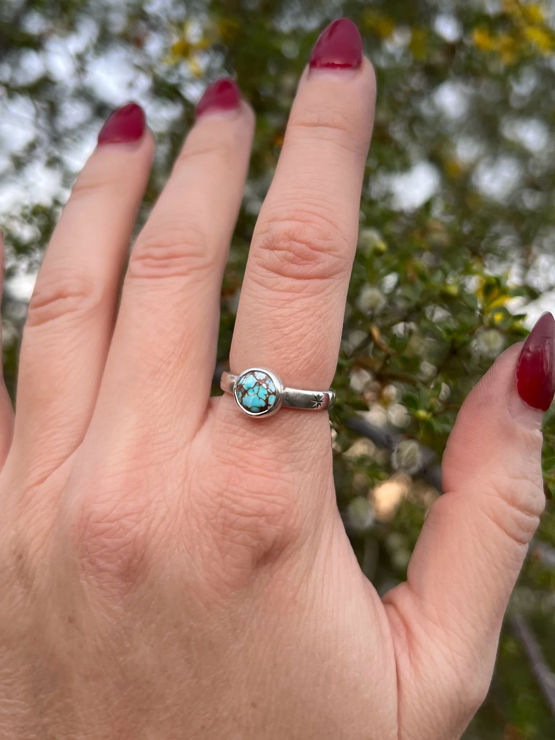 Size 6.25 ring. Completely hand fabricated out of fine and sterling silver. Hand engraved star details go around the band. Golden hills Turquoise stone. Stamped “925” for sterling. All fabrication and engraving done by Elizabeth Williams in Tucson, Arizona.