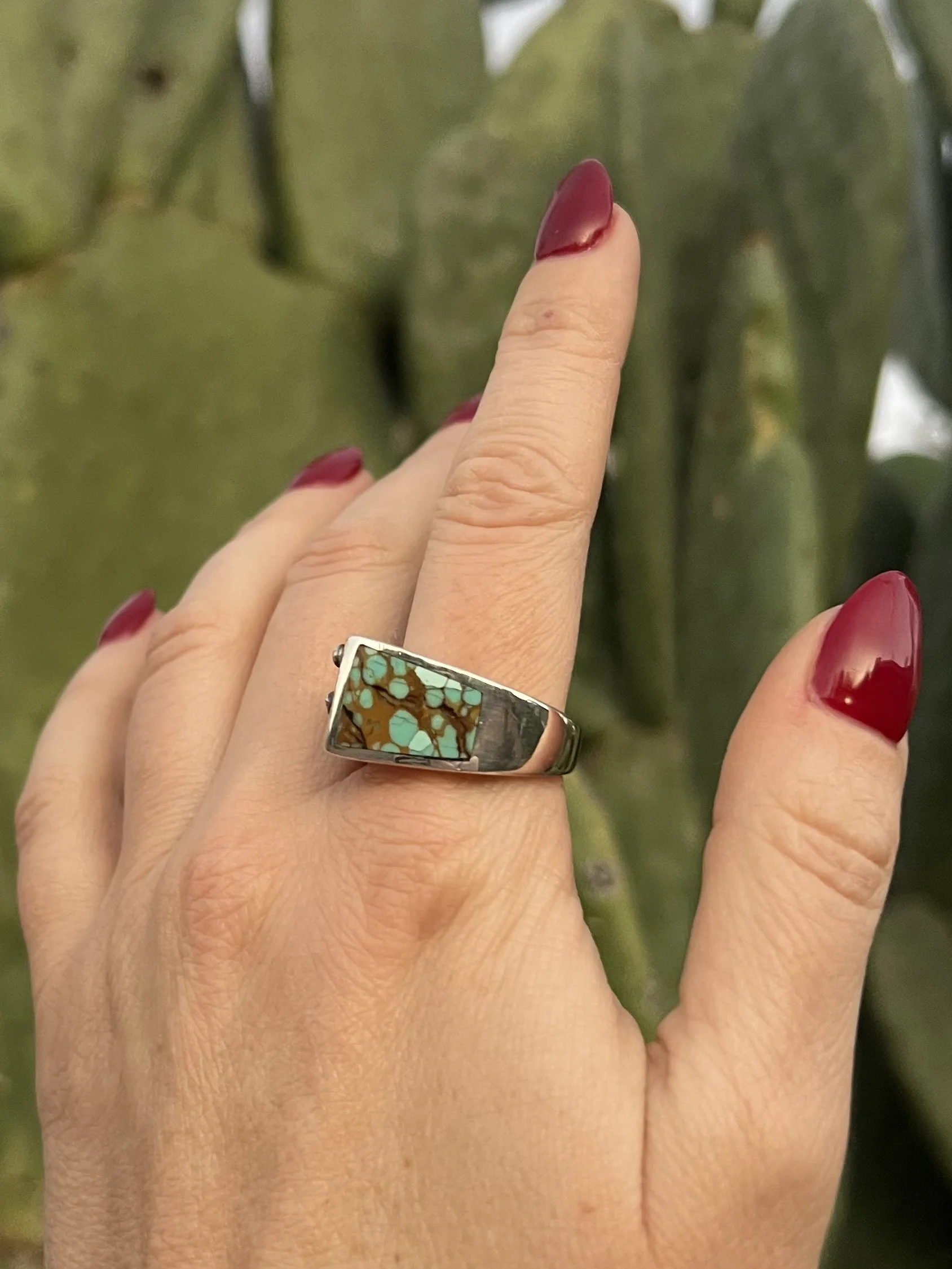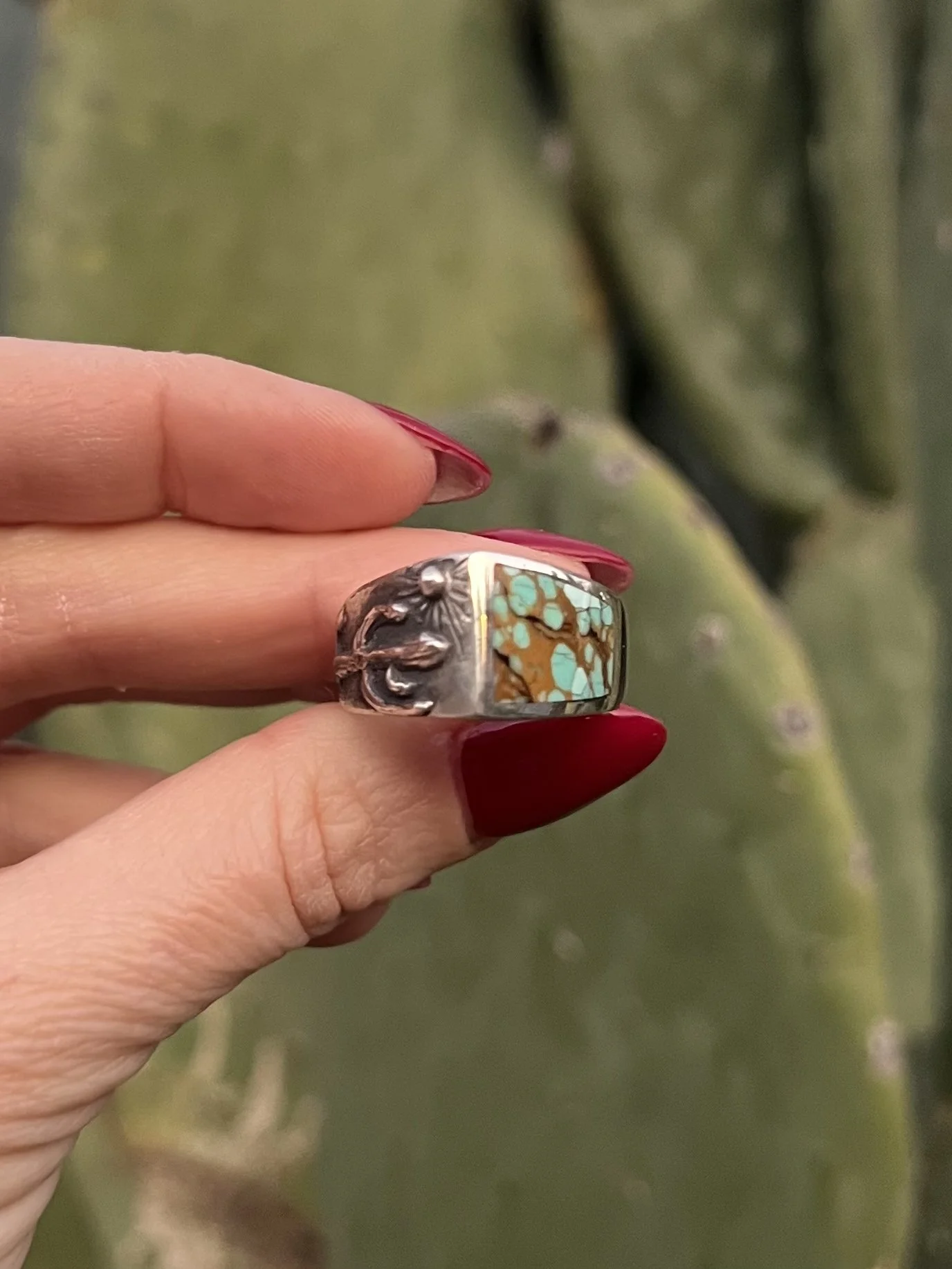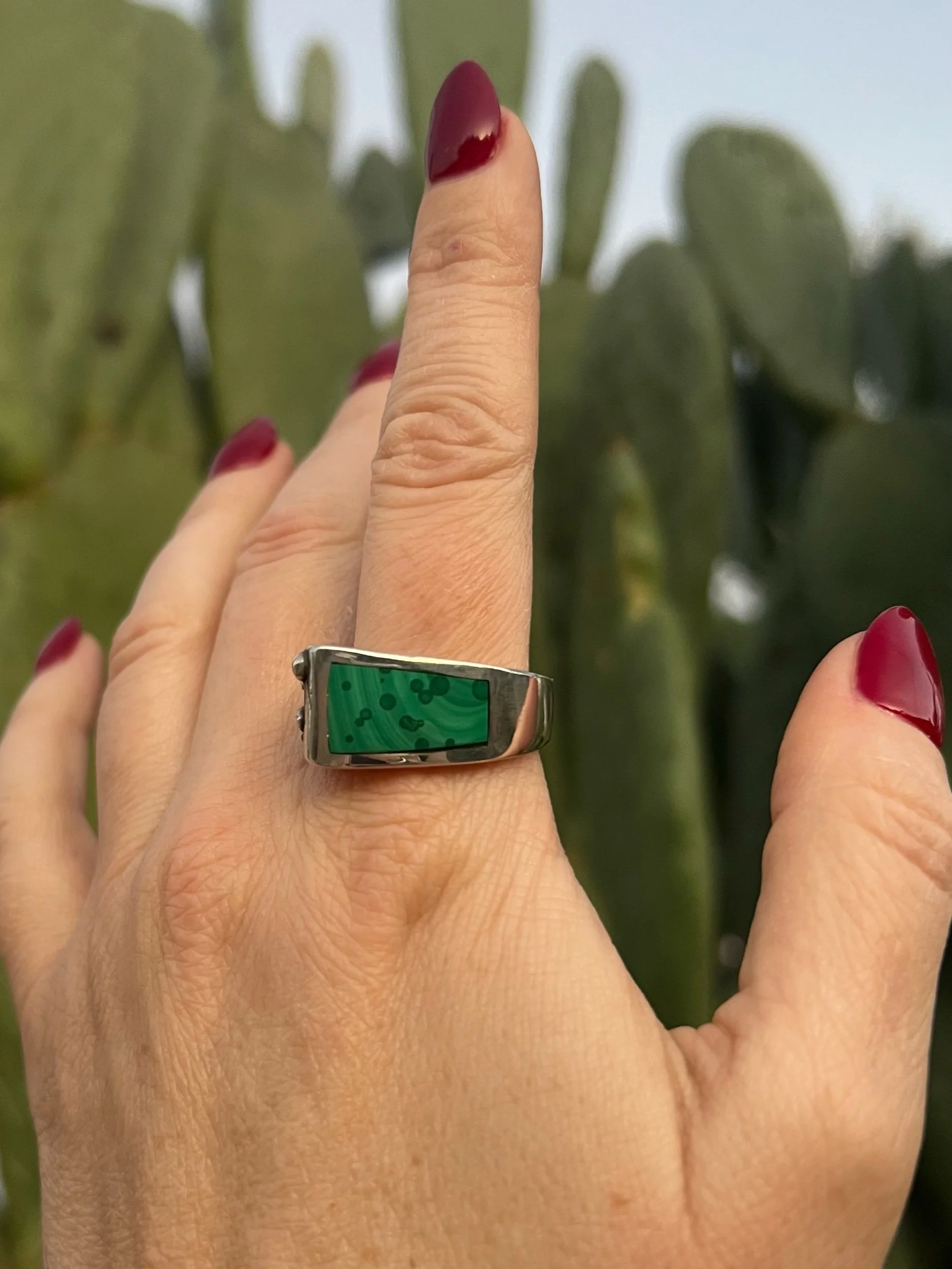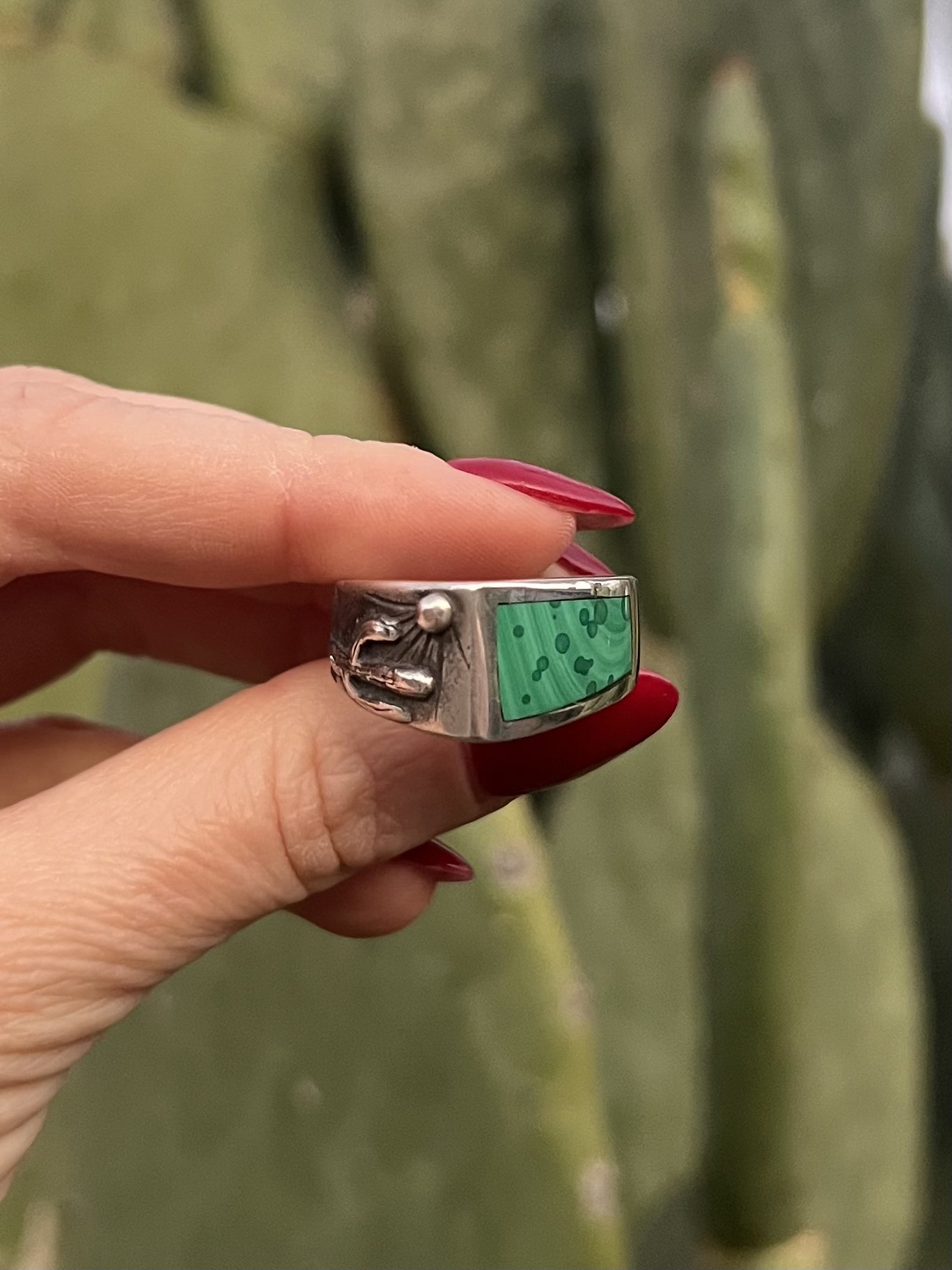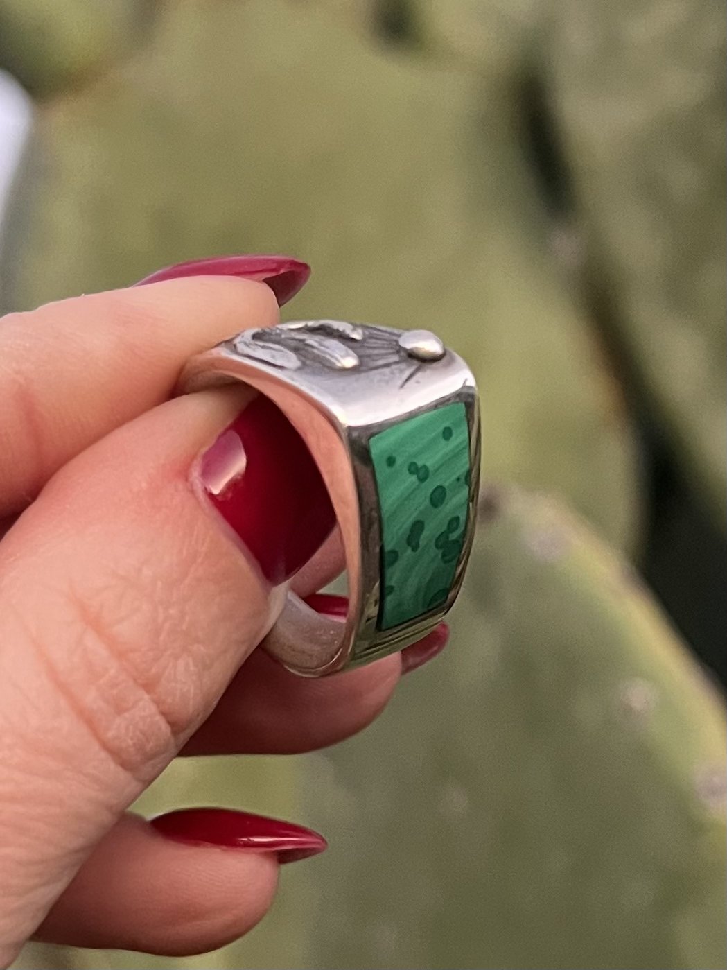 Size 10.25 ring. A beautiful inlayed selection of orbed malachite on one side, a 3D saguaro desert theme on the other. Unique pointed geometric shape allows for both sides to be viewed easily at once. Thick sterling silver that has not been hollowed out from the back. Thick, comfortable band. Signed “EKW” and marked “925” for sterling silver. Entirely made by Elizabeth Williams, from the wax carving to casting and lapidary work.