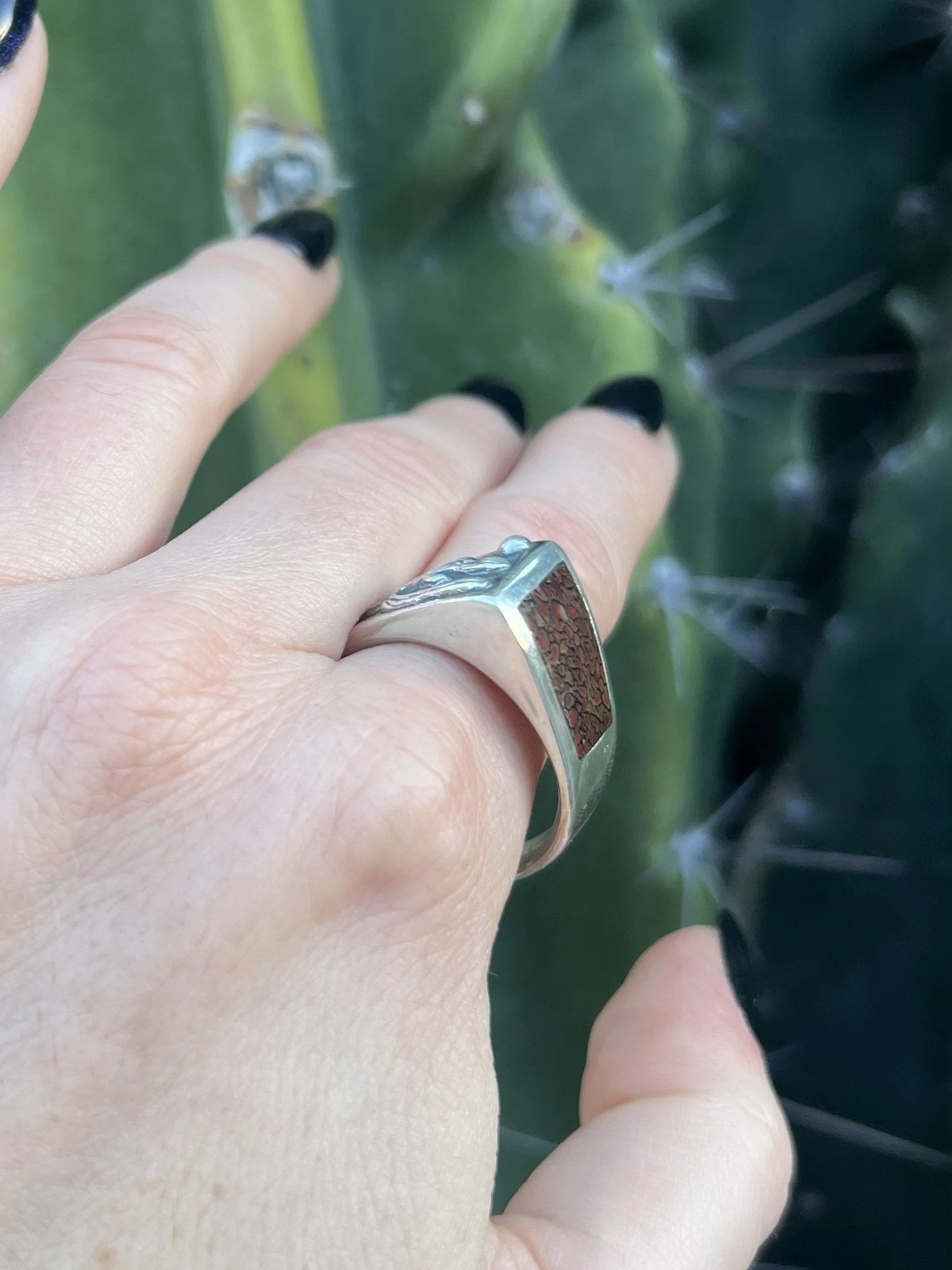 US Size 13.5 ring. A beautiful inlayed selection of Dinosaur bone on one side, a 3D saguaro desert theme on the other. Unique pointed geometric shape allows for both sides to be viewed easily at once. Thick sterling silver that has not been hollowed out from the back. Thick, comfortable band. This design was hand carved in wax and cast in sterling silver. Signed “EKW” and marked “925” for sterling silver. Entirely made by Elizabeth Williams, from the wax carving to small batch casting and lapidary work.